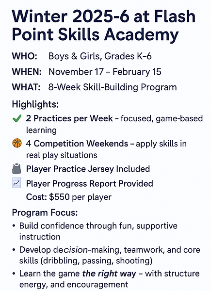 At Flash Point, we’re not chasing weekend trophies. We’re building complete players who love basketball and are equipped to thrive when the competition comes later.